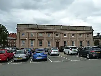 | Assize Courts Block 53°11′09″N 2°53′31″W / 53.18593°N 2.89194°W |  | 1788–1801 | A block containing law courts and offices designed by Thomas Harrison. It is built in sandstone with a slate roof, is in two storeys at the front and four storeys at the rear, and has a slate roof. The main front is symmetrical with 19 bays, the central seven bays projecting forward and containing a portico with two rows of six monolithic columns in Greek Doric style. Inside is the Shire Hall (Court No. 1) with a semi-dome lit by a skylight. Court No. 2 was added in 1875–76, designed by T. M. Lockwood.[8][9] | I |