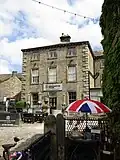 | Black Horse Hotel 54°04′21″N 1°59′49″W / 54.07238°N 1.99697°W | ![]() | Late 18th to early 19th century | The hotel is in gritstone, rendered on the front, with quoins, and a stone slate roof with gable copings and moulded kneelers. There are three storeys, three bays, and an added projecting lean-to bay on the right. The doorway has a plain surround and a flat hood on brackets. To its left is a two-light mullioned window, and to the right is a single-light window. The middle floor contains sash windows, and in the top floor are square windows with casements.[23] | II |