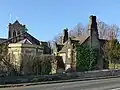 | Ironville House 53°03′43″N 1°21′04″W / 53.06204°N 1.35098°W | ![]() | Mid 19th century | Originally a doctor's house and surgery, it is built in slag lump from the nearby ironworks, with dressings, quoins, sill bands, the eaves cornice, and chimney stacks in red brick, and it has a slate roof. The house consists of a central double pile range with flanking cross-wings projecting at the rear. The central range and left wing have two storeys, and the right wing also has an attic. In the left wing is a porch with a decorative cornice and a flat roof containing a recessed doorway with a semicircular fanlight, and in the right wing is a smaller round-headed doorway. The windows are sashes with shallow segmental heads.[9][10] |