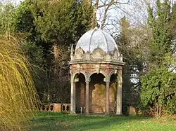 | Gazebo and garden wall, Kelham Hall 53°05′29″N 0°50′38″W / 53.09150°N 0.84396°W | ![]() | c. 1844–46 | The gazebo is in brick, with stone dressings, a string course, moulded and dentilled eaves, and a lead octagonal dome with a finial and a wind vane. There is an octagonal plan, a single storey, and a single bay. On the front is a three-bay round-arched arcade with keystones, two marble columns at the front, and two granite columns at the rear. Above it is a shaped moulded balustrade with round-headed coped panels, finials, and a pierced obelisk finial on a stem. The adjoining wall is in brick with a moulded stone plinth and ramped stone coping. It contains a pair of cruciate gate piers with stepped Renaissance Revival finials.[11][16] | II* |