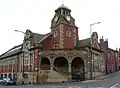 | Armley Public Library 53°47′50″N 1°35′18″W / 53.79719°N 1.58843°W | ![]() | 1901 | The library is on a corner site, and is in red brick with stone dressings and a slate roof. On the corner is a curved entrance loggia with an arcade of three arches with carved spandrels and an inscribed frieze, behind which are steps. Further behind, is a tower with quoins, a stage with clock faces in diagonally set panels, and a bellcote with Ionic pilasters and an ogee-shaped lead-clad dome with a finial. On each front is a Dutch gable with a shaped pediment containing a datestone and a coat of arms. The left front has five further bays with Ionic pilasters, and an entablature with a modillion cornice.[50][59] | II |