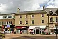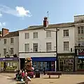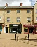 | 17 and 18 Market Place 53°08′39″N 1°11′49″W / 53.14426°N 1.19704°W | ![]() | c. 1820 | Two houses on a corner site, later an office, in painted stone, with string courses, a sill band and a low coped parapet. There are three storeys, and fronts of three and four bays. On the ground floor is a modern shop front with granite piers, a wooden fascia, and a recessed entrance in the corner. The upper floors contain sash windows.[60] | II |