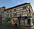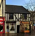 | 21 Church Street, Mansfield 53°08′39″N 1°11′40″W / 53.14404°N 1.19452°W | ![]() | c. 1600 | A house, to which a shop front was added in about 1880. The front is in stone with chamfered floor bands, moulded eaves and a slate roof. There are three storeys and a single bay. On the ground floor is a 20th-century shop front, and the upper floors contain paired sash windows with chamfered surrounds. The house at the rear is in sandstone with a pantile roof, and has two storeys.[5][10] | II |