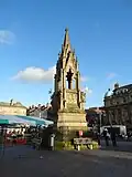 | Cavendish Monument and railings 53°08′39″N 1°11′47″W / 53.14428°N 1.19651°W | ![]() | 1849 | The monument in the centre of Market Place, designed by T. C. Hine, commemorates Lord George Bentinck. It is in stone, and in Gothic Revival style. It has a square base, a square pedestal with a plinth and an inscription, and corner pedestals each with a seated lion carrying a gilt metal banner. Above is a square canopy with gabled angle buttresses, and a panelled base with shields. On each side is a cusped arch with a hood mould under a crocketed gable, above which is an elaborate crocketed spire with a finial, and a tier of traceried gabled lucarnes. The monument is enclosed by iron railings with spiked corner posts.[36][84] | II* |