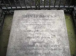 | Tomb chest 53°45′18″N 2°43′23″W / 53.75513°N 2.72316°W | ![]() | 1814 | The tomb chest is in the churchyard of St Mary's Church. It commemorates John Horrocks, Member of parliament and cotton manufacturer, and members of his family. The tomb chest is in a rectangular enclosure surrounded by cast iron railings with urn finials.[3][13] | II |