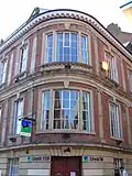 | Lloyd's Bank 53°37′03″N 2°09′31″W / 53.61738°N 2.15868°W | ![]() | 1708 | A hotel on a corner site, later a bank, it is in brick with a stone ground floor and dressings and a roof in slate and copper. There are three storeys, four bays on Yorkshire Street, two on former Lord Street, and a curved bay on the corner. The ground floor is rusticated and contains windows and a doorway on the corner, all with flat heads voussoirs and keystones. The upper floor have fluted Ionic pilasters between the bays, which contain flat-headed windows with architraves and keystones. Below the windows on the middle floor are moulded panels, and on the upper floor is blind balustrading. There are stone cornices between the floors, and a timber modillion eaves cornice. On the top is a pitched roof with a dentilled gables, and a balcony flanked by acorn vases on pedestals.[27][28] | II |