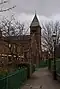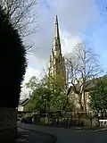| Former United Reformed Church 53°30′56″N 2°15′18″W / 53.51564°N 2.25491°W | ![]() | 1874–75 | Originally a Congregational church, later converted for residential use, it was designed by S. W. Dawkes in Gothic Revival style. It is in stone with a Welsh slate roof and ridge cresting, and consists of a nave, north and south aisles, north and south transepts, a chancel with chapels, the south chapel with an apse, and a southeast steeple. The steeple has a three-stage tower that has buttresses with gablets, pinnacles, flying buttresses, and a spire with lucarnes.[94][108] | II* |