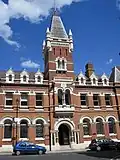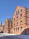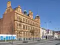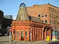 | Arlington House 53°29′04″N 2°15′21″W / 53.48437°N 2.25591°W | ![]() | 1880 | Originally the offices for the Gas Board, it is in red brick on a stone plinth, with a corbelled eaves cornice and a steep Welsh slate roof. The building has two storeys with attics, and a symmetrical front of nine bays. The central bay contains a doorway with a semicircular head and engaged granite pilasters with foliated capitals. Above the doorway is an oriel window with a parapet and gargoyles. The bay rises to a tower with a machicolated parapet, bartizans, and a truncated pyramidal roof with iron brattishing. The outer bays project and have pyramidal roofs, and on the roof are gabled dormers.[115][116] | II |