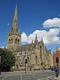 | Salford Cathedral and Cathedral House 53°29′01″N 2°15′40″W / 53.48371°N 2.26107°W | ![]() | 1844–48 | A Roman Catholic cathedral designed by Matthew Hadfield in Gothic Revival style, with the south transept added in 1884. It is in stone with slate roofs, and has a cruciform plan. The cathedral consists of a nave with a clerestory, north and south aisles, north and south transepts, a chancel with aisles, and a steeple at the crossing. The steeple has a tower with angle buttresses, a quatrefoil parapet and a broach spire with four tiers of lucarnes. At the east end is a seven-light window, and polygonal turrets at the corners. The west end contains an arched doorway with a four-light window above and flanked by gabled buttresses with statues under canopies. Also at the west end are four octagonal turrets with crocketed pinnacles and spirelets. Adjoining the east side of the cathedral is the Cathedral House that has an L-shaped plan three storeys and three bays.[70][71] | II* |