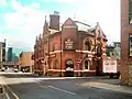 | King's Arms Public House 53°29′03″N 2°15′22″W / 53.48415°N 2.25601°W | ![]() | 1879 | The public house is in red brick with stone dressings, a sill band, a bracketed cornice, a parapet, and a Welsh slate roof. It is on a corner site, with a semicircular plan, two storeys with an attic, six bays on Bloom Street, two on Sackville Street, and a curved bay on the corner. The round-headed doorway has short granite columns with foliate capitals, a hood mould, and the name in mosaic in the spandrels. Above it is a three-light window, and in the attic another three-light window and a balcony with a wrought ironwork on machicolations. At the top is a coped gable containing the royal coat of arms. The other windows are round-headed sashes, and on the roof are gabled dormers.[113] | II |