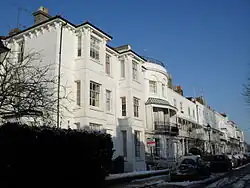 Most of the houses in Warwick Place, a short street leading off the Brighton Road, are listed, but No. 3 Warwick Place has lost its status. The three-storey cobbled flint building's structural features include a bay window and a cornice supported by a modillion. It was listed at Grade II on 21 May 1976 and delisted on 1 August 2000.[25]