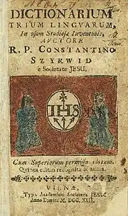 The first Lithuanian language dictionary was compiled by Konstantinas Sirvydas and printed in 1629 as a trilingual (Polish–Latin–Lithuanian) dictionary. Five editions of it were printed until 1713, but it was used and copied by other lexicographers until the 19th century.[1][2]