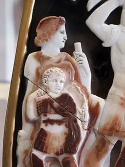 A cameo portrait of a lady with the silhouettes of two infants, has been tentatively identified as Livilla.[15] Although it is possible that the seated woman on the right on the Great Cameo of France represents Livilla, it seems more likely that the female figure seated on the left and holding a roll represents Livilla, depicted there as the widowed wife of Drusus the Younger, seen just above her as one of the three heavenly imperial male figures.[16]