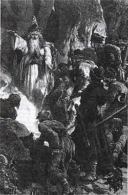 The chronicle also mentioned that Lizdeika was the chief pagan priest (Kriwe Kriwaito) and that he was found in an eagle's nest (Lithuanian lizdas means nest). Maciej Stryjkowski added additional note that Lizdeika was found in an eagle's nest or, according to others, in a cradle in a tree by Grand Duke Vytenis who raised him as his son.[4] Various 19th-century authors, including Adam Kirkor and Michal Baliński, claimed that Lizdeika was found in Verkiai, a suburb of Vilnius.[5] Researchers of the Lithuanian mythology, including Vladimir Toporov and Gintaras Beresnevičius, analyzed Lizdeika's origin and noted its shamanistic motifs.[6][7]