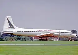 Lloyd International Airways Ltd was a private, British independent[nb 1] airline formed in 1961 to operate worldwide charter flights. It commenced operations with a single Douglas DC-4 piston airliner from Cambridge Marshall Airport.[1][2] Lloyd International concentrated on passenger and cargo charters with four-engined, long-range aircraft. It also had links in Hong Kong since its inception and flew to the Far East regularly.[3] During the mid-1960s, the airline began re-equipping its fleet with Bristol Britannia and Canadair CL-44 turboprops, all of which featured large cargo doors and palletised freight systems.[3][4][5] Long-range Boeing 707 jets joined the Lloyd International fleet during the early 1970s for use on affinity group passenger and freight charters to North America and the Far East.[3][6][7] Lloyd International ceased operations in June 1972.[8][9]