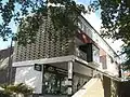Crawley was designated a New Town in January 1947, and the Crawley Development Corporation was set up[43] to acquire land, raise finance and provide all the buildings and services required to meet the aims of planning consultant Anthony Minoprio's masterplan—the most important of which was to reach a target population of 50,000 by 1962.[44] Self-contained residential areas ("neighbourhoods") were laid out around the existing town centre, which was greatly extended. The ancient village of Ifield, the mostly Victorian development of Three Bridges (centred on a pre-railway era hamlet with a pub and village green)[45] and other nearby settlements were all joined up.[46] Each neighbourhood had standard features at its centre: one or more churches, a community centre, a shopping parade, a pub and, in some cases, schools.[47] Some of the better-quality buildings have been awarded locally listed status. The Anglican churches in the Southgate and Gossops Green neighbourhoods (built in 1958 and 1962 respectively), Pound Hill's Roman Catholic church of 1965, with its "striking" triangular design, and the nearby United Reformed Church building (erected in 1955–57 for Congregationalists), are all on the list. So are the shopping arcades at Gossops Green and Tilgate: the former, described as "excellent" by Nikolaus Pevsner, dates from the mid-1960s,[48] while Tilgate's is from the previous decade.[49] The "impressive" structure was on one occasion visited by a delegation of civic dignitaries from Yugoslavia, who travelled to Crawley to inspect its architecture:[50] such visits were common in the early New Town era (for example, more than 2,000 official visitors from 48 countries came in 1958).[51] A 1950s primary school in Tilgate, with a distinctive tower which is believed to hide the chimney of an incinerator, also features on the list.[49] There were few flats anywhere in the New Town, as incoming residents preferred houses,[52] but the Deerswood Court development (which preserved the grounds of the old mansion whose site it occupied) won a Civic Trust Award and has been locally listed.[53]