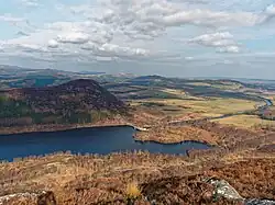 Fairburn wind farm overlooks Loch Achonachie from the slopes of Beinn an Rubha Riabhaich, a hill on its south shore. The wind farm is privately owned by SSE.[3]