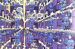 For the design for the TVA, Herron pulled visual inspiration from the films Metropolis (1927), Blade Runner (1982), and The Hitchhiker's Guide to the Galaxy (2005), and the Brutalist architecture of southeast London to mix with the "midwest style" of the series Mad Men. She also looked to the "retro-futuristic" visuals of Brazil (1985). From the comics, Herron was drawn to "these amazing images of desks going on into infinity" to incorporate into the TVA design.[107] Production designer Kasra Farahani had similar inclinations as Herron for the design of the TVA, separately feeling Brazil would be a good inspiration since that film is "like this big bureaucracy crushing the individual". As with the Brutalist architecture Herron was drawn to, Farahani also looked to Soviet-influenced Eastern European midcentury modernism as well as American midcentury modernism for "the skinning, the palette, and the whimsical patterns" inside the TVA.[110] Some parts of the TVA are constructed from the same stone that makes up the Citadel at the End of Time.[2] The goal for Farahani was to create a space that "you can't tell immediately if this is a warm and friendly place or if it's a place that wants to destroy you".[110]