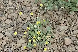 Lomatium nudicaule is a species of flowering plant in the carrot family known by the common names barestem biscuitroot, pestle lomatium,[1]: 110 [2] desert parsley, Indian celery, and Indian consumption plant.[3] It is native to western North America from British Columbia to California to Utah, where it is known from several habitat types, including forest and woodland. It is a perennial herb growing up to about 20–45 centimetres (7.9–18 in) tall from a thick taproot. It generally lacks a stem, the inflorescence and leaves emerging from ground level. Each leaflet is 2 to 5 cm (0.8 to 2 in) long and ovoid to orbicular in outline with coarse teeth near the tip.[2] The inflorescence is borne on a stout, leafless[4] peduncle widening at the top where it blooms in an umbel of yellow flowers.