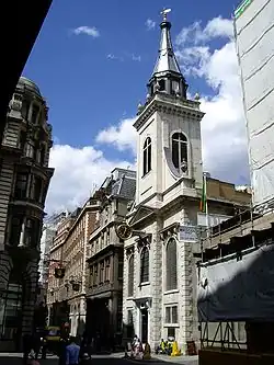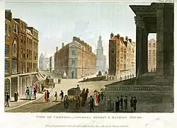 ![]() Lombard Street from Bank junction. The street continues to the left of St Mary Woolnoth church; to the right is King William Street. | |