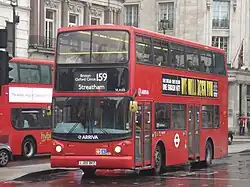 On 9 December 2005, route 159 was the last route to be converted from Routemaster to low-floor bus operation, with new Alexander ALX400 bodied Volvo B7TL double deckers taking over. The route was converted gradually from the start of service on the last day, with the last Routemaster to depart from Marble Arch arriving at Brixton Garage at around 14:40.[2][3]