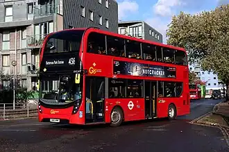 On 19 November 2011, route 436 was retained by Go-Ahead London and was converted to double deck operation with Alexander Dennis Enviro400Hs and Alexander Dennis Enviro400s as part of the Mayor of London's policy to replace the O530Gs.[6] The route was one of the final three in London to use articulated buses, their withdrawal was criticised due to the resulting reduction in capacity.[7][8] They were phased out in an attempt to reduce fare evasion.[9] The former vehicles now operate in Brighton and Hove.[10]