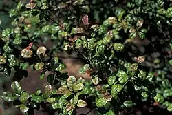![]() | Lophomyrtus obcordata | Rōhutu | Grows to around 8 m tall but is more tree-like in form. It has very small inversely heart-shaped (petiole at the pointed end) leaves and produces clusters of tiny white flowers in summer that are followed by small dark red to purple-red berries. The cultivars 'Dainty' and 'Microphylla' have pink-tinted leaves. | It occurs throughout New Zealand except for much of Southland. |