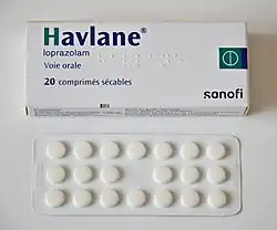 - ^ Clark BG, Jue SG, Dawson GW, Ward A (June 1986). "Loprazolam. A preliminary review of its pharmacodynamic and pharmacokinetic properties and therapeutic efficacy in insomnia". Drugs. 31 (6): 500–516. doi:10.2165/00003495-198631060-00003. PMID 2874007.