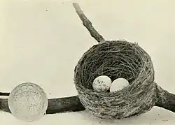 The fantail built a cup-shaped nest, with a rudimentary tail, of decayed wood fibre and grass, bound with cobwebs and lined with fine grass, situated on a horizontal branch. The clutch was usually three, sometimes two, eggs.[3]