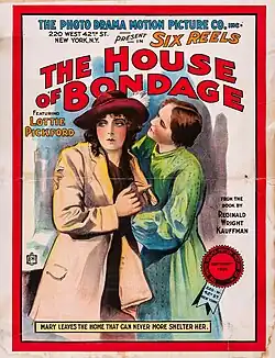 Away from her elder sister, Pickford's first starring role came in 1914 in The House of Bondage. It was a vice film, with Pickford playing a prostitute, in stark contrast to her sister's image as "America's Sweetheart". The film did not receive good reviews, being considered too crude.[11] In 1915, Pickford appeared in Fanchon, the Cricket, opposite both her siblings. It is the only film in which all three Pickford siblings appear. It was thought lost until rediscovered in the 20th century at the British Film Institute.[12]