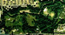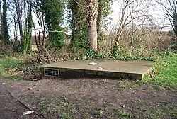 Beneath the park lie several WW2- and Cold-War era tunnels and bunkers. In the late 1930s the Admiralty sank a deep reinforced "Combined Headquarters" (ACHQ) bunker into the chalk near the Lower Lines (contracted to Francois Cementation Co.)[31][32] This tunnel complex housed the Commander-in-Chief, Nore (Chatham) from December 1939 onward. Its concrete-encased plotting room and entrances survive (now sealed); outside, two sealed doorways set into the ditch brickwork mark the secondary entrance and escape exits of that bunker.[33] The tunnels served as the Naval Reserve HQ (HMS Wildfire) into the 1960s, after which they were damaged by fire and deliberately sealed to preserve them. Medway Road anti-tank obstacles ("dragon’s teeth" or "pimples")[34] guard the park's southern edge, and several have been listed Grade II for their historic value.[35][36] Throughout the park one can see relics of 19th-century siege-train training. Excavations have revealed counterscarp galleries and countermine chambers leading from a bastion into the surrounding ground.[37] The Royal Engineers – whose barracks were adjacent – used the Lower Lines for practice, even installing experimental devices here. In fact, an archaeological report noted two prototype 19th‑C electric searchlight emplacements on the Lower Lines, reflecting the Royal Engineers experimenting on defense technology.[38] One such searchlight mounting (now just a concrete pit) still bears a WW2‑era carving: "P.O. WIDLEY – DEC 1941" is etched into its interior concrete.[39] Anti-aircraft gun emplacements once dotted the ramparts as well; their concrete bases partly survive, though most were buried or demolished. For example, two 12-pounder naval deck guns were mounted on the ramparts in 1940, and concrete platform remnants can still be seen.[40]