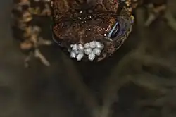 The adult toadfly strategically lays its eggs near the nostrils of the common toad, displaying a preference for weakened or injured individuals. Upon hatching, the larvae delicately feed on the nostril tissue, gradually navigating into the intricate passages of the nasal cavities. As they mature, these voracious larvae exhibit an insatiable appetite, devouring not only the host's eyes but also its brain and other vital tissues. Alternatively, the eggs may be laid in wounds and eat the host's flesh.