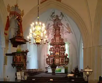 Münstermann carved many altars, pulpits and organ cases for churches, especially in the Duchy of Oldenburg. His largest surviving altar is in the castle church at Varel, where he worked on the altar, pulpit and font between 1613 and 1618. Around 1590 he worked in his winter studio on epitaphs for St Ansgar's church in Bremen. There are important altars, pulpits and font covers by Münstermann in two churches in Stadland, St Matthew's in Rodenkirchen (1629–31) and St Secundus' in Schwei (1618–38). The church in Hohenkirchen in Wangerland has an altar (1620) and pulpit (1628) by him, and St Hippolytus' church in Blexen in Nordenham has altar figures and a pulpit (1638). His organ case for the former castle chapel at Rotenburg an der Wümme (1608) and a stone statue of Hercules are in the Focke Museum in Bremen.