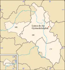 Lunca de Jos (Hungarian: Gyimesközéplok, Hungarian pronunciation: [ˈɟimɛʃkøzeːplok], colloquially Középlok) is a commune in Harghita County, Transylvania, Romania. It lies in the ethno-cultural region Székely Land. The commune is composed of nine villages: Barațcoș (Barackospatak), Lunca de Jos, Puntea Lupului (Farkaspalló), Poiana Fagului (Bükkhavaspataka), Valea Boroș (Borospataka), Valea Capelei (Kápolnáspataka), Valea Întunecoasă (Sötétpataka), Valea lui Antaloc (Antalokpataka), and Valea Rece (Hidegség).