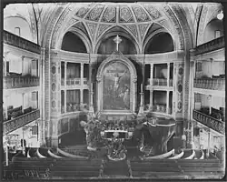 In 1895-1897, the interior of the church was radically changed according to the design of Professor Maximilian Messmacher, the largest architect of the late 19th century, a leading representative of late historicism architecture. Messmacher saw the goal of the reconstruction in bringing the interior elements to a certain stylistic unity ('... the interior of the church should have been decorated more uniformly, while Renaissance and Greek motifs should have received free and equal expression').[20] According to Messmacher's design, a new painting of the walls and vaults was created: all the architectural elements of the interior were divided into separate geometrically regular sections - panels and were maximally saturated with decor. In addition, two side entrances were installed on the sides of the main entrance to the church hall, electric lighting was installed, instead of cast iron fences, carved oak fences appeared on all tiers of galleries, and the organ choir was expanded.