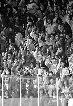 Fans of Cornell's Hockey program, aptly named the "Lynah Faithful," are among the loudest and most dedicated fans in the country, making Lynah Rink, many believe, college hockey's most hostile arena. The raucous crowd support gives the Big Red one of the largest home ice advantages in college hockey, losing under 20% of their games on home ice since Lynah opened in 1957.[7] The Lynah Faithful are cheered on by one cowbell, usually played by a zealous undergraduate,[8] but only during the second and third periods (including overtime) at approximately mid-period. Many of the other regular chants of the Faithful are listed on a website, which serves as a useful primer in the history and traditions of Cornell Hockey when initiating new students into the Lynah Faithful.[9] After the end of all games at Lynah, when the opposing team leaves the ice, the Cornell team gathers at center ice and raises their sticks to salute the faithful as they applaud the team. This is known as the Lynah salute.