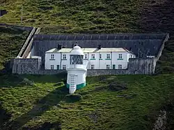 Lynmouth Foreland Lighthouse (also called the Countisbury Foreland Lighthouse, after the nearby village) is located on Foreland Point; it was originally simply named 'The Foreland Lighthouse'.[2] First lit on 28 September 1900, the lighthouse was built to assist vessels passing through the Bristol Channel, and is a round brick tower painted white.[3] The light is 67 metres (220 ft) above the high tide, and flashes 4 times every 15 seconds.