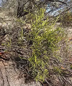 Lysiana murrayi (or Mulga mistletoe)[3] is an erect or spreading hemi-parasitic shrub in the Loranthaceae (a mistletoe family) which occurs in all mainland states of Australia except Victoria. It has flat narrow leaves (which may sometimes be semi-terete with a channel on the upper surface). The leaves are 2.5–6 cm long, 1–3.5 mm wide, do not have a distinct petiole, and the venation is not visible. The inflorescence is a solitary flower or pair of flowers without a common peduncle. The pedicels are 8–20 mm long, and strongly winged towards the apex. The spreading, membranous bracts are 2–3 mm long, and rounded at the apex. The corolla of the mature bud is usually 18–28 mm long, and white, yellow or pink. The fruit is globose, 7–12 mm long, and pink or red.[4]