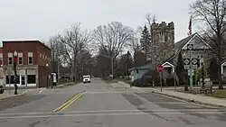 M-49 starts as the continuation of SR 49 into Michigan from Ohio. The highway crosses the state line south of Camden east of the tripoint with Indiana and Ohio. Running north through rural Hillsdale County, the roadway follows Edon Road through farm land. The highway follows two sweeping curves to cross Territorial Road and continue into the village of Camden. M-49 follows Main Street through town and turns northeasterly on the north side of the village on the way to Reading. Returning to a due-north course,[4][5] the highway crosses a branch of the Indiana Northeastern Railroad on the south side of Reading.[6] The Edon Road name gives way to Main Street through the city. M-49 runs north out of Reading, once again called Edon Road, through farm lands dotted with occasional trees. At Weston Road on the southeast side of Allen, the highway turns to the northeast to a junction with US 12 (Chicago Road). M-49 turns west along US 12, running concurrently into the village. M-49 resumes its northerly course at Railroad Street, separating from US 12 in the process. Outside of town, the roadway changes names to Allen Road, and through more Southern Michigan farmland, M-49 runs north to Genesee Road. The highway turns east on Genesee to Anderson Road, and then north to Litchfield. Crossing into that city, M-49 follows Chicago Street to the intersection with M-99 downtown. At that junction, M-49 terminates nearly 25.5 miles (41.0 km) north of the state line.[4][5] No part of the highway has been listed on the National Highway System,[7] a system of highways important to the nation's economy, defense, and mobility.[8]