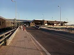 The airport consists of two terminals arranged in a T-shape, with the main access road on one side and the tarmac on the other, while the control tower is located in the junction between the two terminals. Four parking lots are located directly in front of the Terminal 1 building: the P4 lot is reserved for short term (visitor) parking and lots P6, P7, and P8 are used for long term (traveler) parking. P5, located on the left of the T1 building, serves taxi cabs and tourist buses.[19]