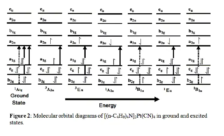 To have an A- and B-term in the MCD spectrum, a molecule must contain degenerate excited states (A-term) and excited states close enough in energy to allow mixing (B-term). One case exemplifying these conditions is a square planar, d8 complex such as [(n-C4H9)4N]2Pt(CN)4. In addition to containing A- and B-terms, this example demonstrates the effects of spin-orbit coupling in metal to ligand charge transfer (MLCT) transitions. As shown in figure 1, the molecular orbital diagram of [(n-C4H9)4N]2Pt(CN)4 reveals MLCT into the antibonding π* orbitals of cyanide. The ground state is diamagnetic (thereby eliminating any C-terms) and the LUMO is the a2u. The dipole-allowed MLCT transitions are a1g-a2u and eg-a2u. Another transition, b2u-a2u, is a weak (orbitally forbidden singlet) but can still be observed in MCD.[15]