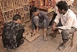 In Cambodia, where basically the same game is played, it is known as ouk (Khmer: អុក, pronounced [ʔok]) or ouk chatrang (Khmer: អុកចត្រង្គ, pronounced [ʔok.caʔ.ˈtrɑŋ]).[3]
