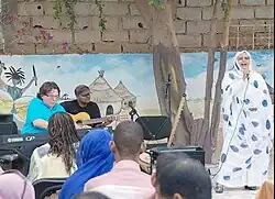 Music festival appearances have been a large part of Malouma's career. The first time she participated in an international festival was in Carthage, Tunisia in 1988; her performance proved to be highly successful.[8] Malouma returned to the stage in August 2003, appearing at the Festival des Musiques Métisses in Angoulême, France, combining traditional Moorish music with a more modern approach in numbers from her album Dunya. She was not only selected as "artiste de l'année" (artist of the year) but was nicknamed "Diva des Sables" (Diva of the Sands).[8] Her success continued in October of the same year at the World Music Expo in Seville, Spain, where she was selected by the jury as a featured performer.[34][35] One of the highlights of Angoulême's Festival des Musiques Métisses was her nostalgic rendering of "Mreïmida". The song proved equally popular in Mauritania at the 2004 Nouakchott Festival of Nomadic Music. She was finally permitted to take part after her ban had been lifted. She appeared there with another female Mauritanian star, Dimi Mint Abba, and was accompanied by the French pianist Jean-Philippe Rykiel on a synthesizer.[8]