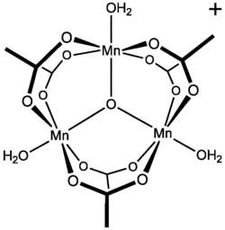 Although manganese(III) triacetate has not been reported, salts of basic manganese(III) acetate are well characterized. Basic manganese acetate adopts the structure reminiscent of those of basic chromium acetate and basic iron acetate. The formula is [Mn3O(O2CCH3)6Ln]X where L is a ligand and X is an anion. The salt [Mn3O(O2CCH3)6]O2CCH3.HO2CCH3 has been confirmed by X-ray crystallography.[2]
