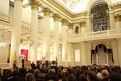 The Mansion House was paid for in an unusual way: the City authorities, all Church of England men, found a way to tax those of other Christian denominations, particularly the Rational Dissenters. A Unitarian named Samuel Sharpe, banker by day and amateur Egyptologist by night, wrote about it in the 1830s, striking a blow against the Test and Corporate Acts. The article was republished in 1872. Sharpe argues that the Mansion House "remains as a monument of the unjust manner in which Dissenters were treated in the last century" (i.e. the 18th, in contrast to his own 19th, century).[9] William Edward Hartpole Lecky in his History of England during the Eighteenth Century (1878) describes the funding of the construction of the Mansion House as "a very scandalous form of persecution".[10]
