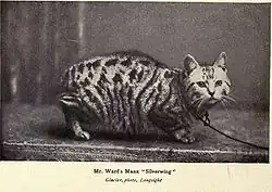 Manx cats have been exhibited in cat shows, as a named, distinct breed (and with the modern spelling "Manx"), since the late 1800s. In that era, few shows provided a Manx division, and exhibited specimens were usually entered under the "Any Other Variety" class, where they often could not compete well unless "exceptionally good in size and markings".[19] Early pet breeding and showing expert Charles Henry Lane, himself the owner of a prize-winning rare white rumpy Manx named Lord Luke, published the first known (albeit informal) breed standard for the Manx in his 1903 Rabbits, Cats and Cavies,[19] but noted that already by the time of his writing "if the judge understood the variety" a Manx would be clearly distinguishable from some other tailless cat being exhibited, "as the make of the animal, its movements and its general character are all distinctive."[19] Not all cat experts of the day were favourable toward the breed; in The Cat: Its Points and Management in Health and Disease, Frank Townend Barton wrote in 1908: "There is nothing whatever to recommend the breed, whilst the loss of the tail in no way enhances its beauty."[5]