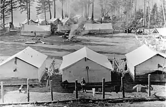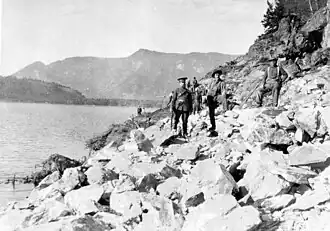 The wagon road along the western side of Mara Lake having been destroyed, interned aliens built sections of a new road along the eastern side during World War I.[97] The camps, which operated June 1915–July 1917,[98] spent winter at Two Mile and summer at Six Mile. Rolf Wallgren Bruhn was the road superintendent. The shore road along the southern part of the lake was blasted through rocky cliffs, with rock removal and grading by hand.[61] A commemorative marker exists about 40 metres (131 ft) south of the Wolfe Rd junction. The Hummingbird Beach Resort at Swansea Point now occupies the former camp site.[99]