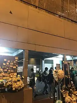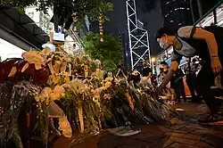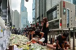 On the evening of Leung Ling-kit’s death, dozens of citizens laid flowers outside Taikoo Place to mourn him,[31] including pastor Chu Yiu-ming, one of the "Occupy Central Trio."[32] Additionally, trams passing by sounded their horns in tribute.[31] Some celebrities also expressed their feelings on social media by posting plain black images or in other ways. These included Joey Yung, Sammi Cheng, Charlene Choi, Stephy Tang, Kenny Kwan, Louis Cheung, Carlos Chan, Linda Chung, Cherry Ngan, Crystal Fung, Jeannie Chan, Heidi Lee, Harriet Yeung, Colin Mak, Wyman Wong, Charlotte Cheung, Hins Cheung, Pakho Chau, Hubert Wu, Endy Chow, Eman Lam, Winki Lai, and Yeung Chiu.[33] Miriam Yeung also posted "R.I.P" but later deleted it, which caused some controversy.[34]