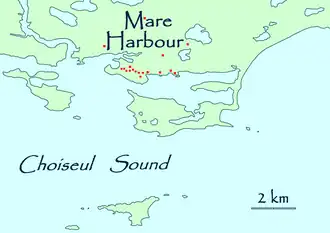 During the 1982 Falklands War, Mare Harbour was considered as one of the potential sites for a British amphibious landing[2] but the British landings took place on San Carlos Water in the west of East Falkland, on Falkland Sound. Mare Harbour was considered open to air attack.