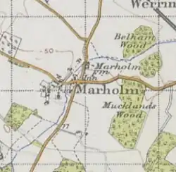 MARHOLM, a parish in Peterborough district, Northampton; adjacent to the Great Northern railway, 4½ miles NW by N of Peterborough r. station. Post town, Peterborough. Acres, 1,790. Real property, £1,534. Pop., 172. Houses, 33. The property belongs chiefly to the Hon. G. W. Fitzwilliam. The living is a rectory in the diocese of Peterborough. Value, £311. * Patron, the Hon. G. W. Fitzwilliam. The church is partly Norman, partly early English, partly later English; consists of nave and chancel, with porch and tower; and contains monuments of the Fitzwilliams. There are alms houses with £14 a year.[4]